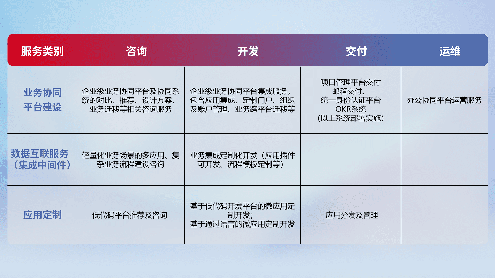 针对钉钉、、、、企微、、、IDaas等平台级产品提供产品的规划、、方案、、交付、、、定制化开发等服务,,,实现如统一协同办公、、、智能客户服务、、混合会议管理、、、、智能数据查询、、、等业务场景,,实现数字化转型。。。